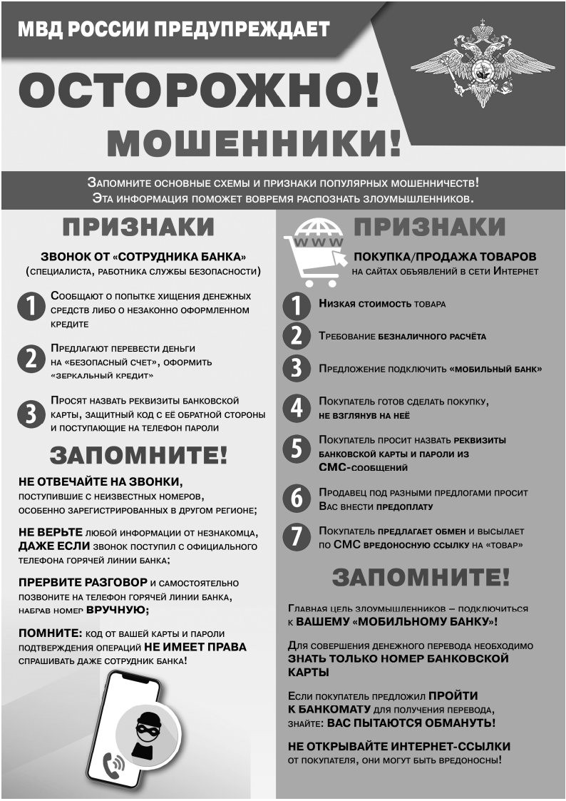 ВНИМАНИЕ! В настоящее время отмечается рост числа мошеннических действий в различных сферах общественной жизни. Преступники всё чаще отдают предпочтение обманным схемам как более эффективному способу незаконного обогащения
